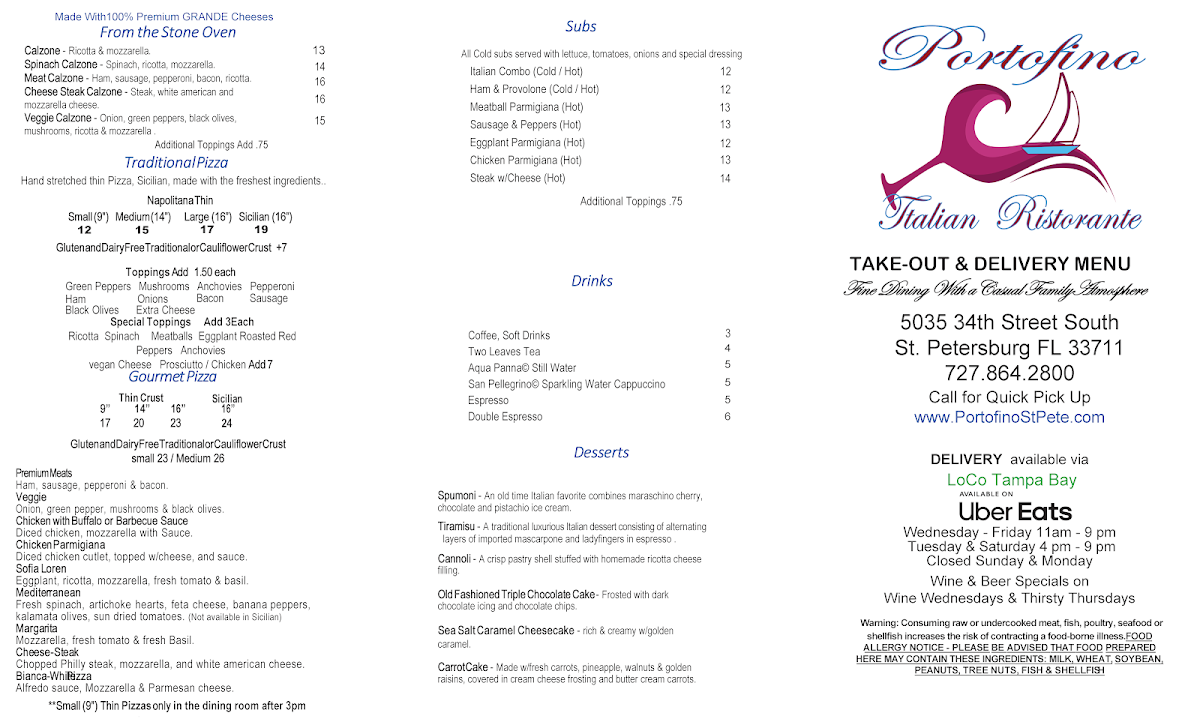 Welcome to Portofino Italian Ristorante, your cozy culinary haven tucked away in St. Petersburg, FL. As you step inside, you'll be greeted by a warm, inviting atmosphere that echoes traditional Italian charm. The menu is a delightful showcase of authentic flavors, featuring hearty dishes that are both delicious and reasonably priced.
